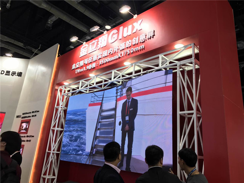 利亞德集團公司金立翔展出了可彎曲LED顯示產(chǎn)品及一種可直接踩踏的LED地面顯示產(chǎn)品。可彎曲LED顯示產(chǎn)品獨創(chuàng)屏體弧形彎曲技術(shù),能實現(xiàn)一定限度內(nèi)屏幕弧形彎曲,從根本上解決了傳統(tǒng)LED屏只能純平組裝的缺點,一定程度上滿足各種內(nèi)弧、外弧、圓形屏、波浪形的屏幕造型要求,打造更具創(chuàng)意的視覺享受。